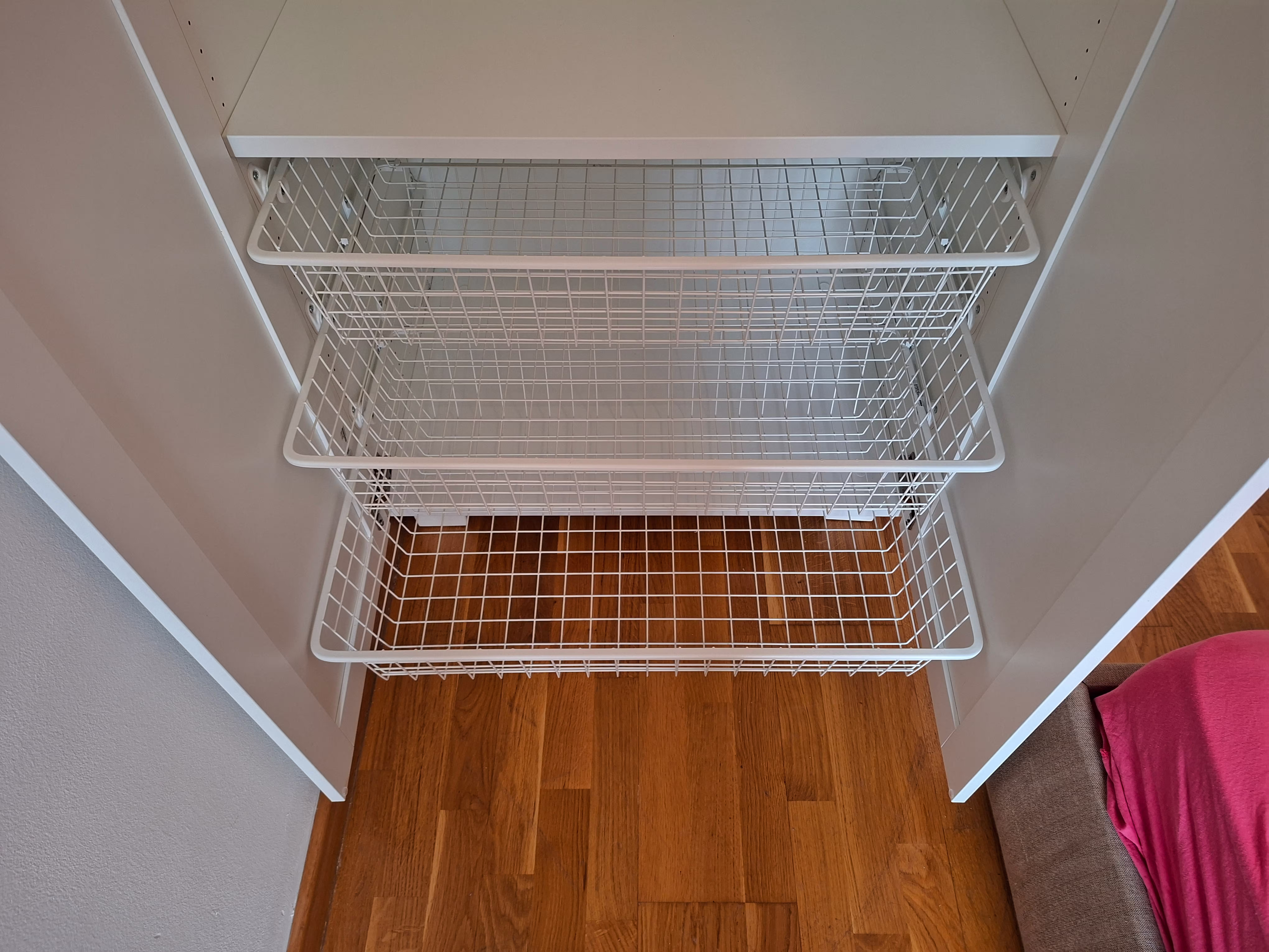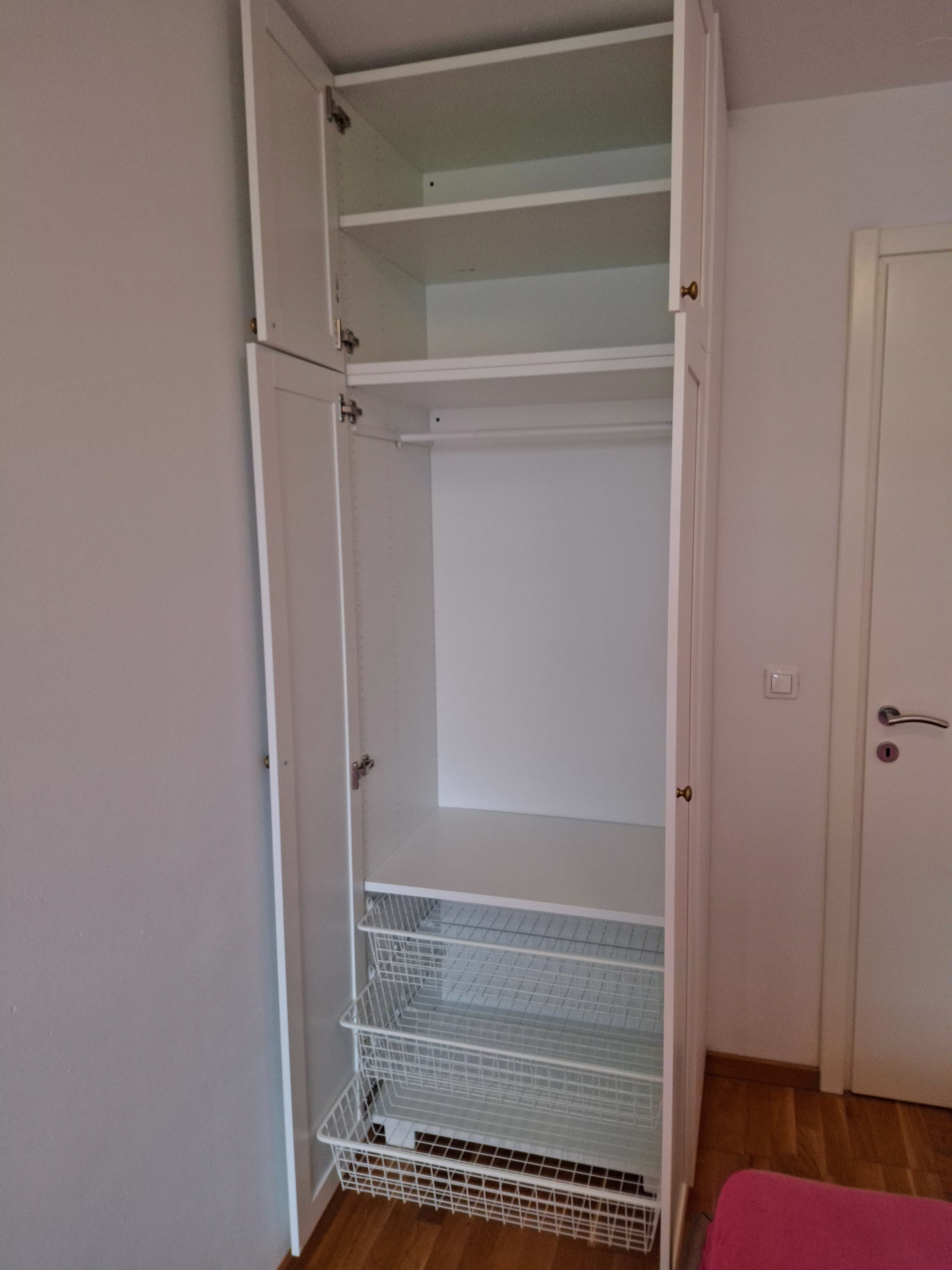 Montirali smo bijeli IKEA PLATSA ormar s četvero bijelih vrata. Unutrašnjost ormara opremljena je policama, pomičnom vješalicom za odjeću te s tri praktične košare za odlaganje.