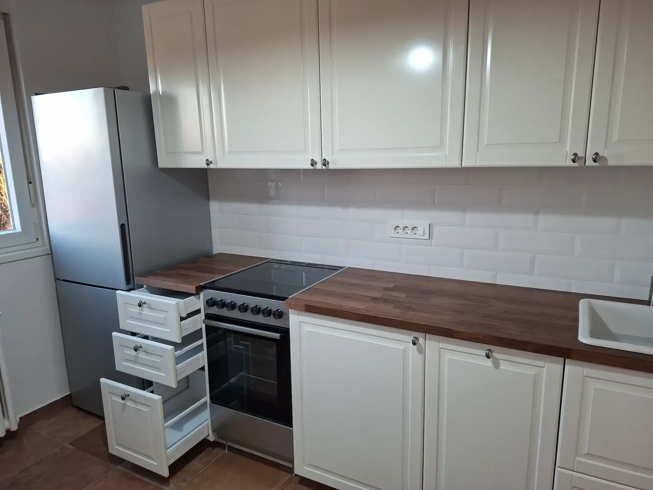 Specifičnost projekta je ta što smo sa klasičnim šarafima, koje glume nogice, nivelrali samostojeće Končar kuhalo, koje u orginalu ima male nogice, kako bi bilo u potpunosti poravnato s ostatkom doljnjih kuhinjskih elemenata.