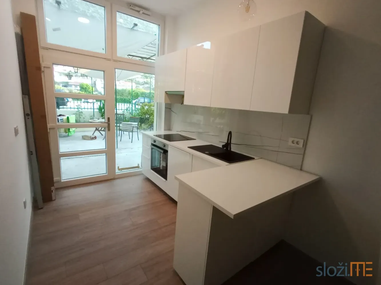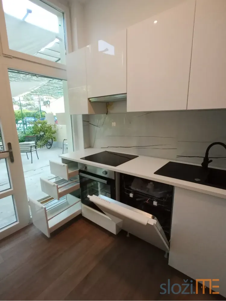 Smontirana kutna Metod kuhinja. Kuhinja je bijela i visoki sjaj. Kuhinja ima složenu ugradbenu Ikea perilicu suđa i i crni Ikea sudoper
