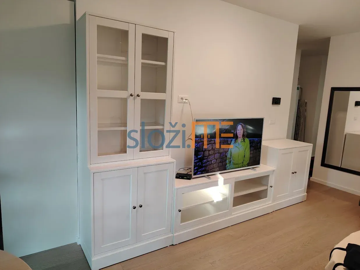 U ovom projektu montirali smo rustikalnu HAVSTA kombinaciju iz IKEA-e – sustav za odlaganje i pripadajuću TV klupicu u rustikalno bijeloj boji.