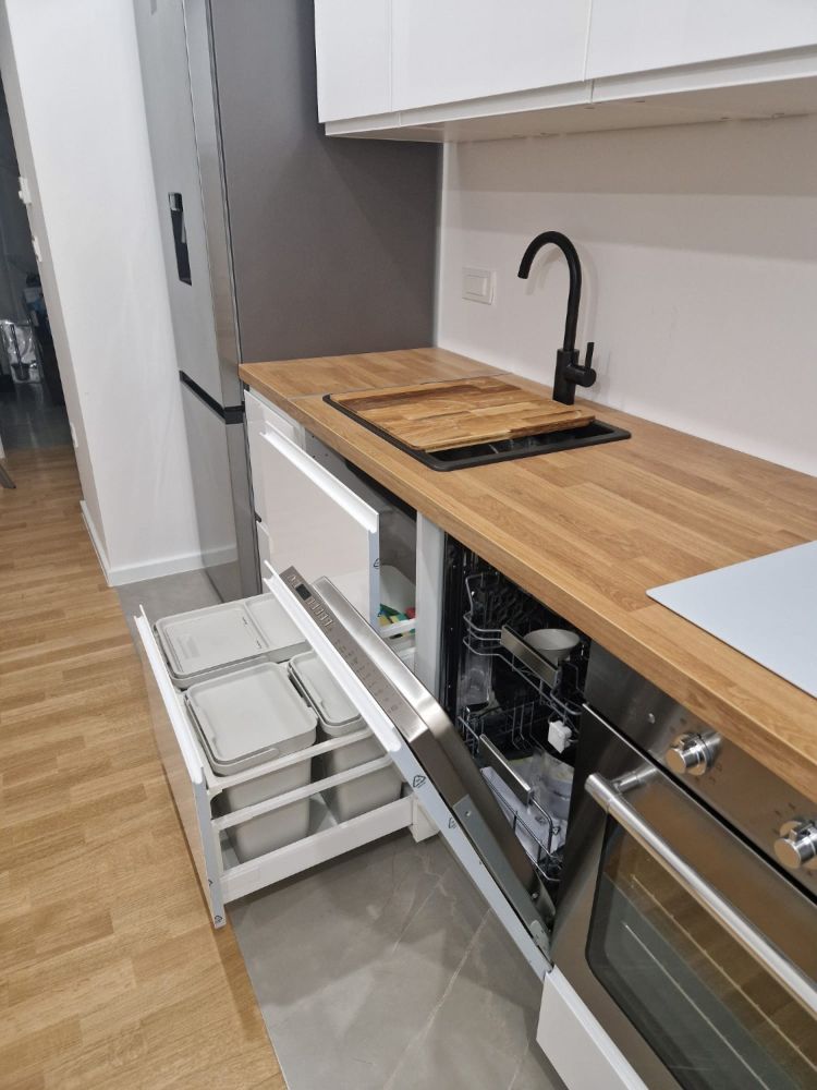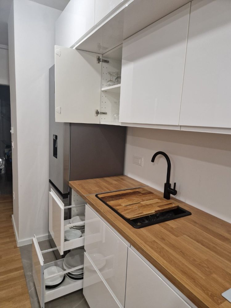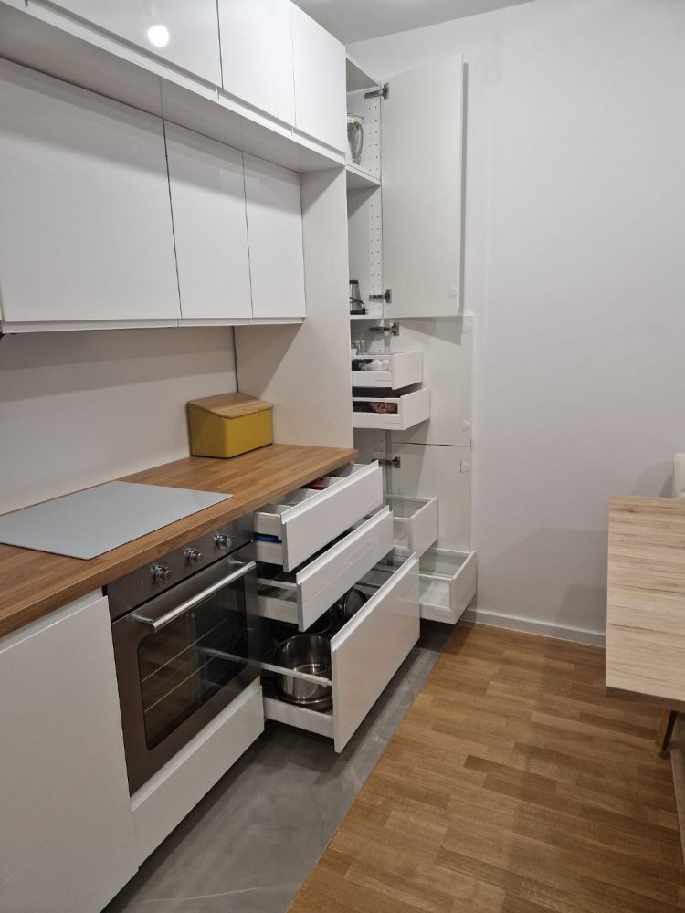 Prilikom montaže kuhinje posvetili smo veliku pažnju svakom detalju. Iako je montaža bila zahtjevna, uspjeli smo je složiti da bude savršeno poravnata i da svi mehanički dijelovi, vodilice i šarke (panti) savršeno funkcioniraju.