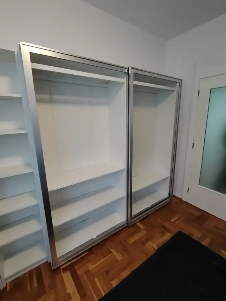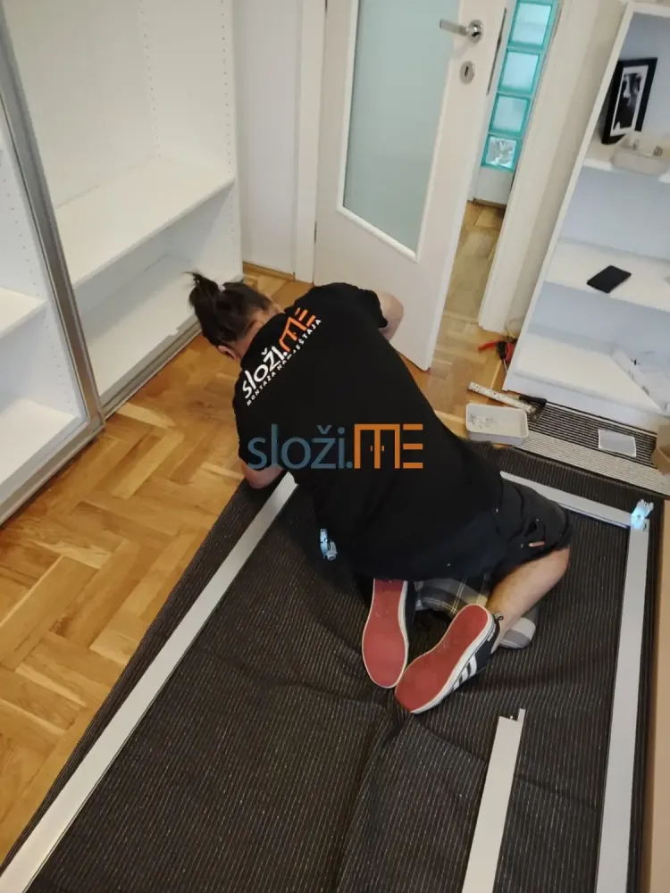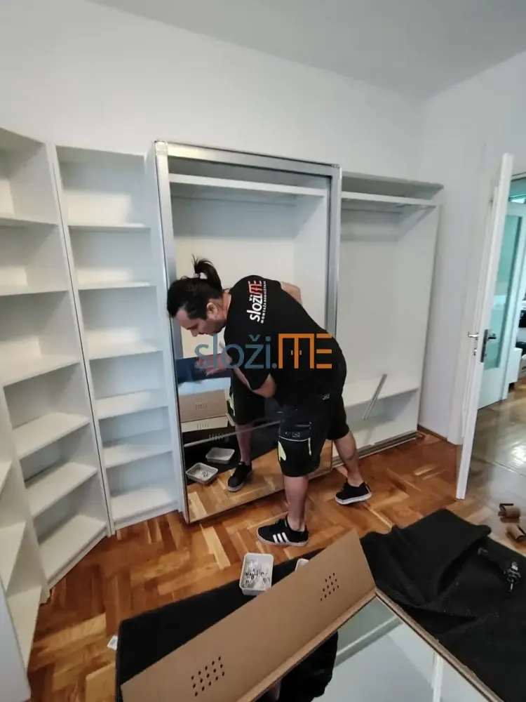 Smontirali smo IKEA PAX ormar s staklenim kliznim vratima. Korpusi PAX ormara su bijele boje, dok ogledala na vratima daju dubinu prostoru.