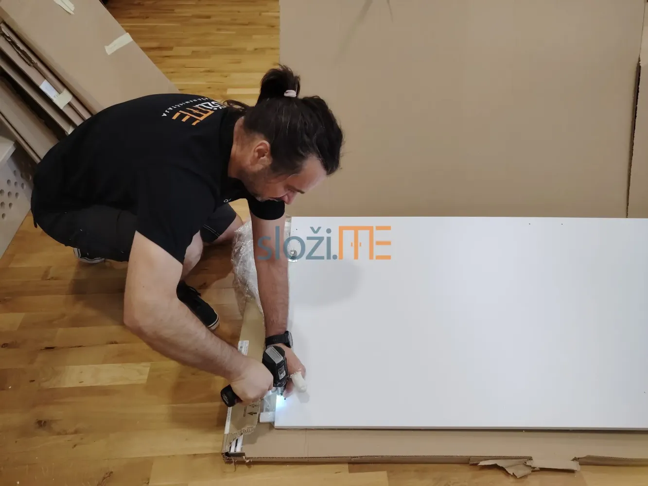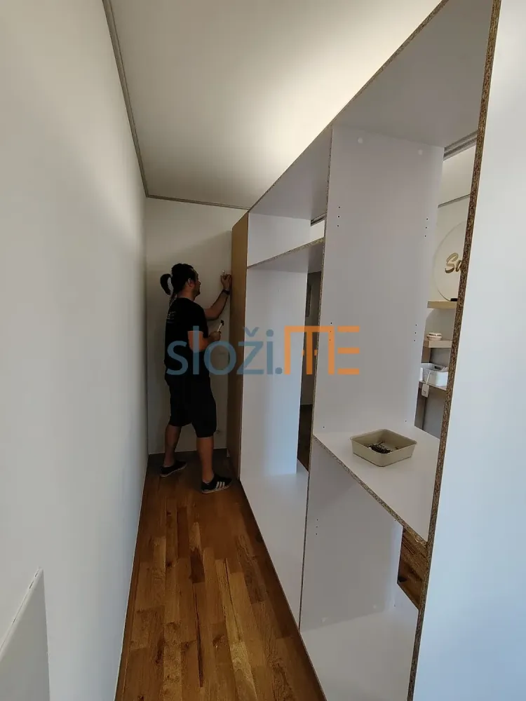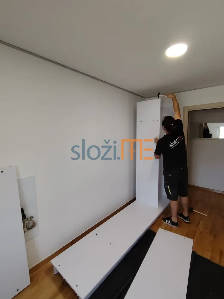 Ormar se standardno slaže na podu, a zatim se podiže u uspravni položaj. Međutim, za takav postupak potrebno je imati dovoljno slobodnog prostora na podu, što ga u ovome slučaju nije bilo.