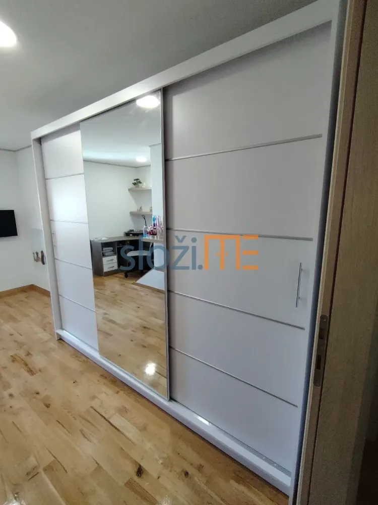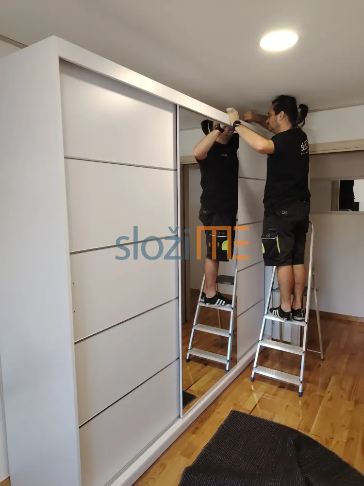 Danas smo obavili montažu ormara s troje kliznih vrata od kojeg su dvoje obična vrata a jedna su vrata sa ogledalom. Model ormara je Dorian VI u bijeloj boji, a kupljen je putem Favi dućana. Dimenzije ormara su dosta velike