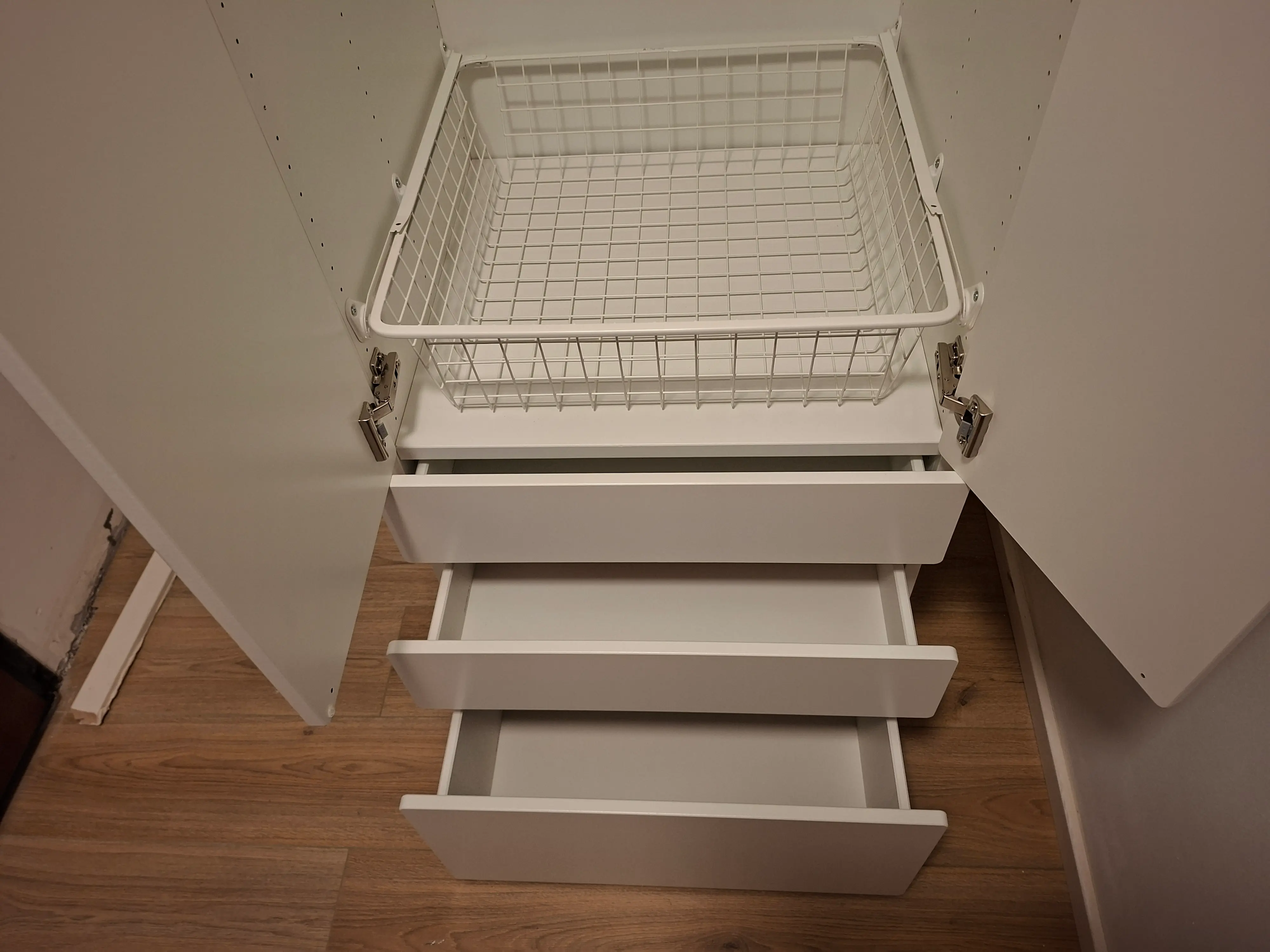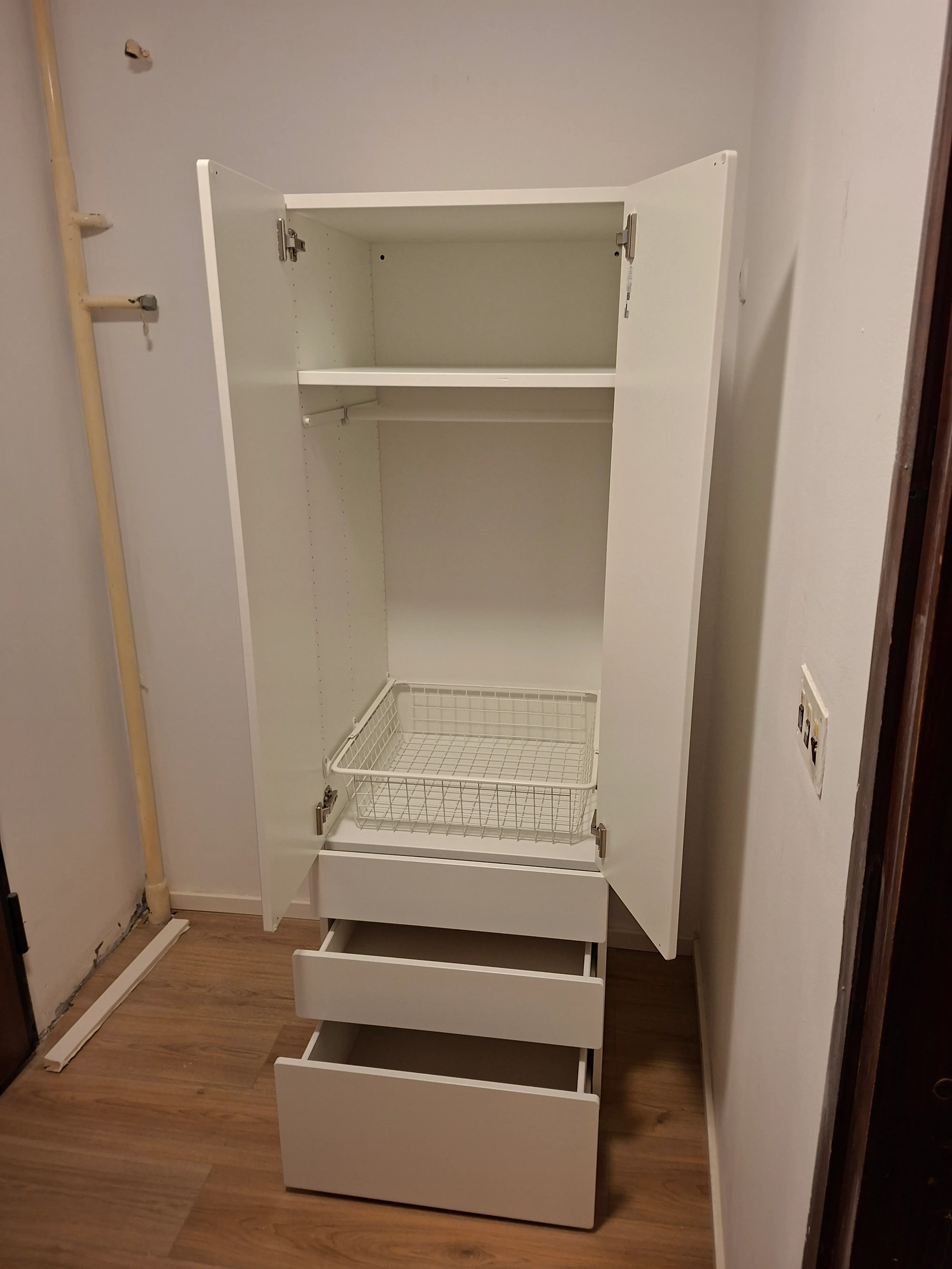 Montirali smo IKEA SMÅSTAD / PLATSA ormar u bijeloj boji s tri ladice, dvoja vrata i jednom košarom. Ovaj funkcionalan i moderan ormar idealan je za dječje i mladenačke sobe.