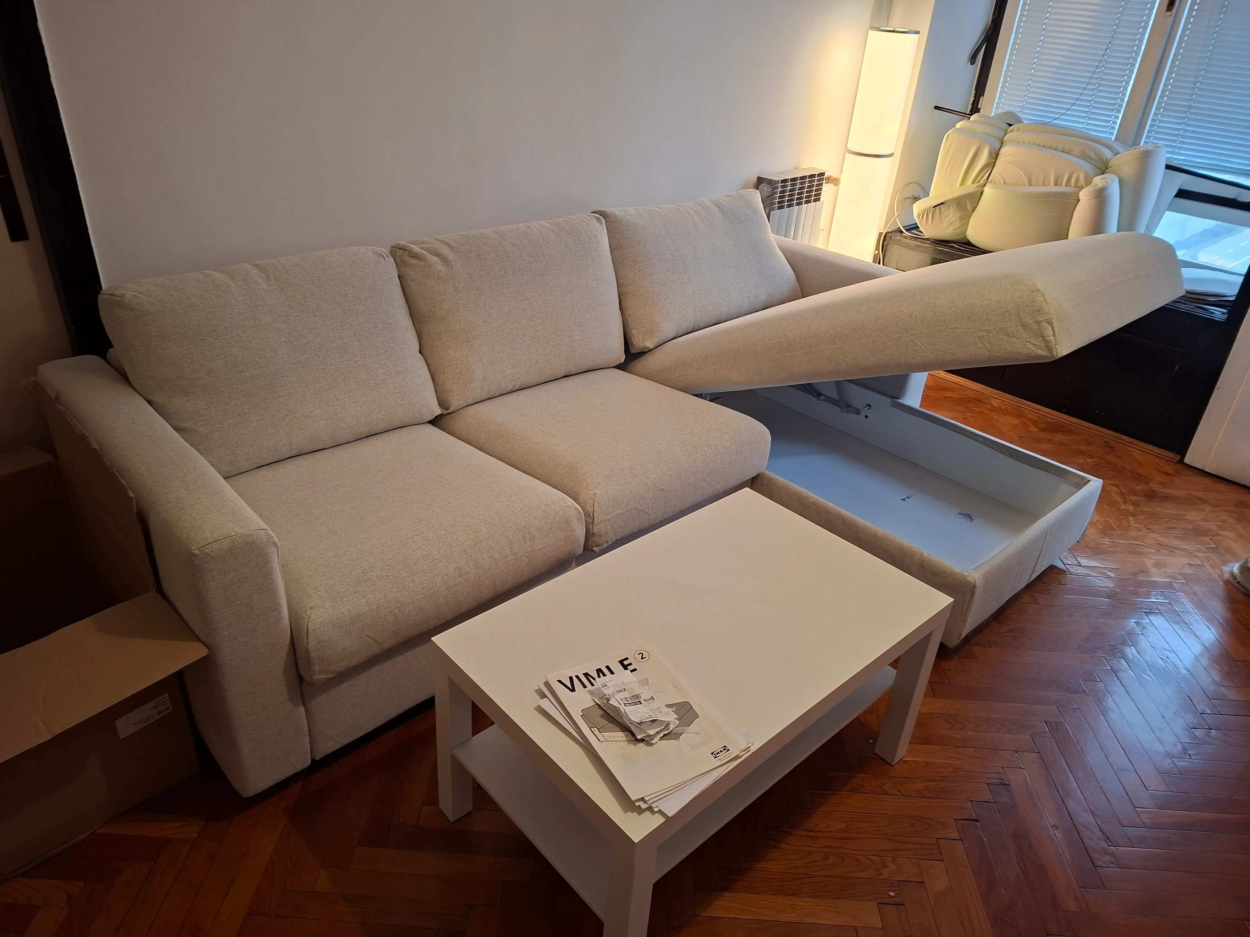 Složili smo još jedan IKEA VIMLE trosjed s počivaljkom u hallarp bež boji. Njihove VIMLE trosjede/elemente možete kombinirati u raznim pozicijana. U ovom slučaju montaža je izvršena u prostoriji gdje je dio sa mehanizmom za podizanje okrenut sa desne strane.